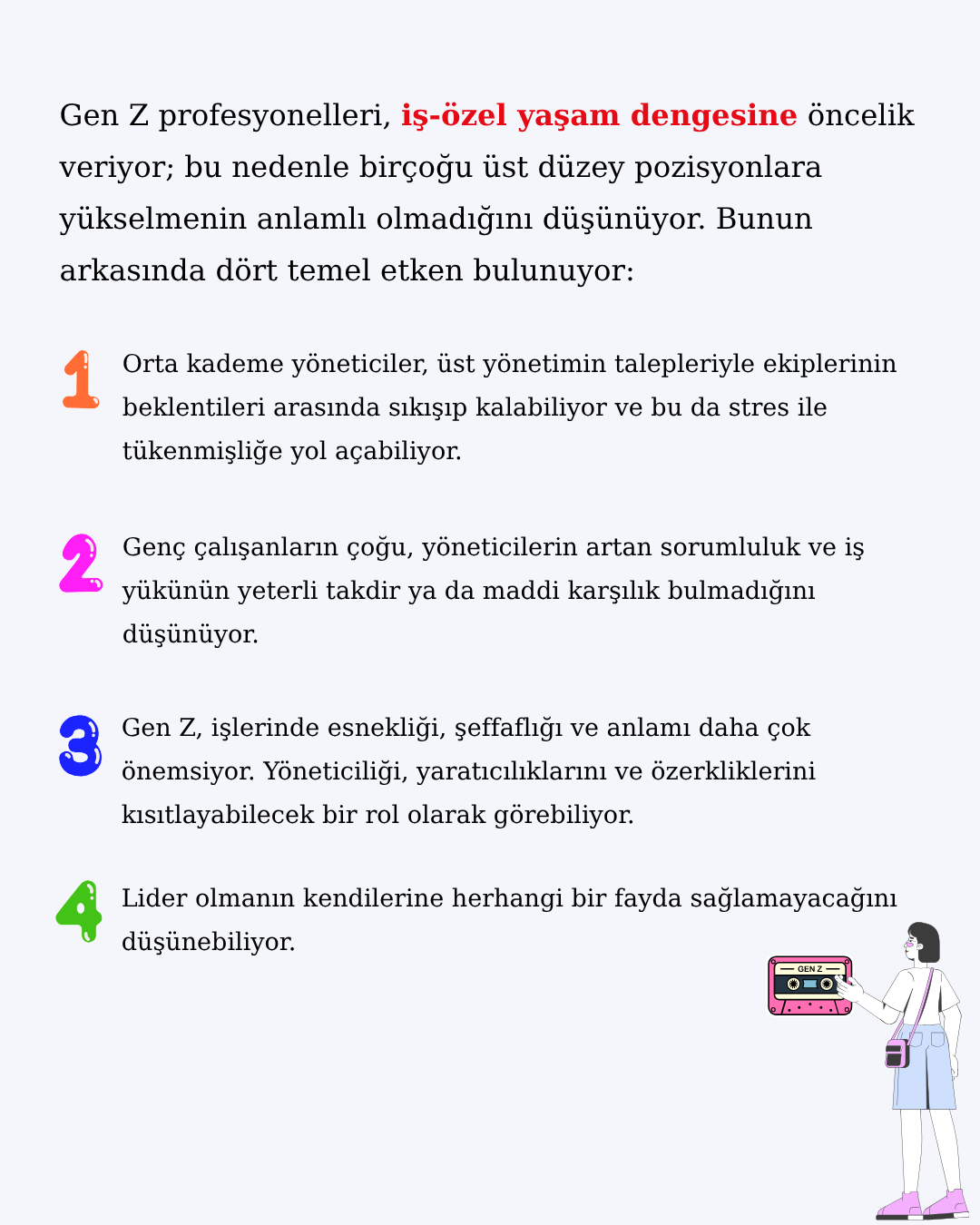 İş-özel yaşam dengesine öncelik veren Gen Z profesyonelleri, çoğu zaman yöneticiliği cazip bir kariyer adımı olarak görmüyor. Bunun arkasında stres ve tükenmişlik riski, artan sorumluluklara karşı yeterli takdir ve maddi karşılık bulamama gibi nedenler öne çıkıyor.