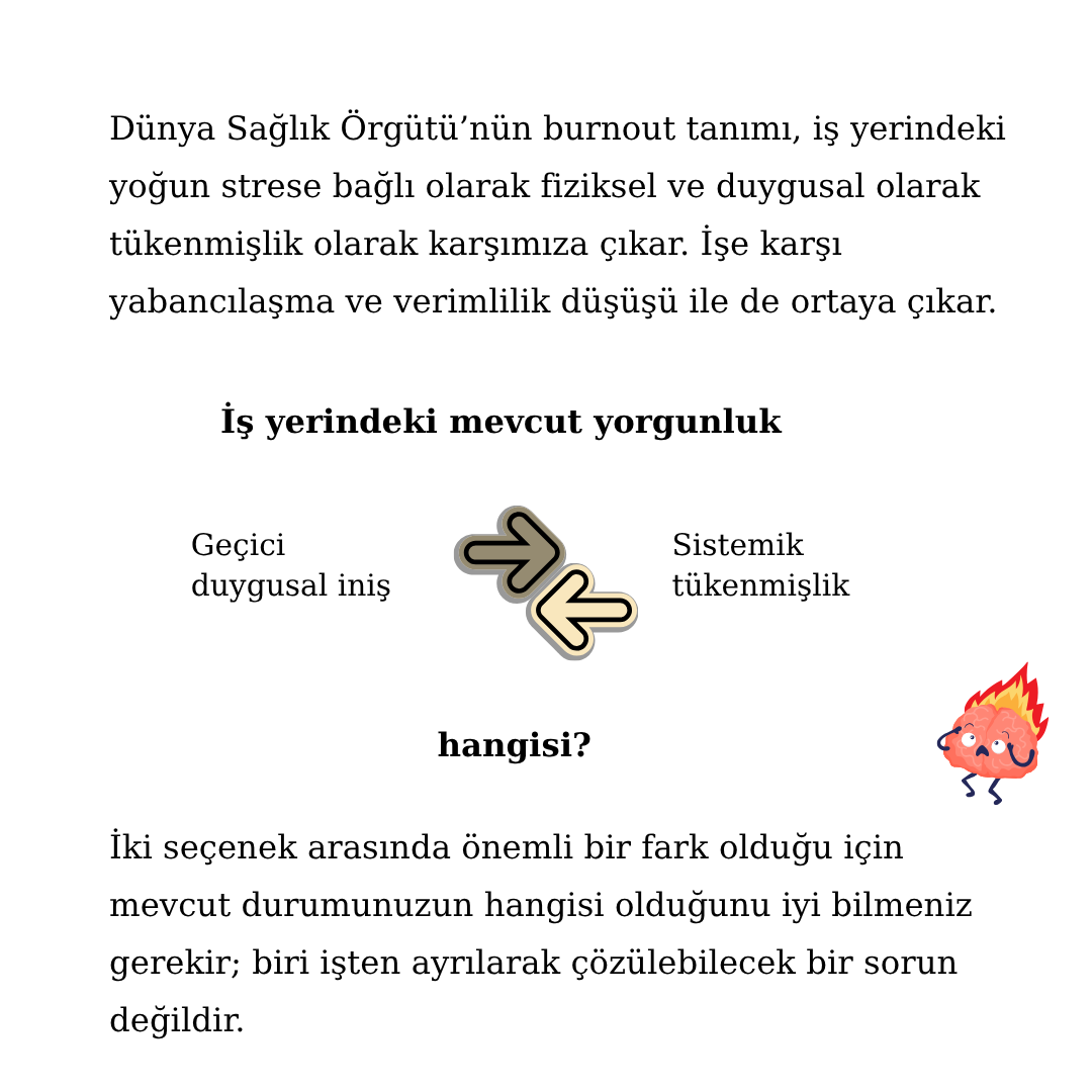Eğer tükenmişlik durumu yaşıyorsanız işten ayrılmanız sorunu çözmez. Çözümün kalıcı olması için, çalışma koşullarının değerleriniz ve prensiplerinizle uyumlu hale gelmelidir.